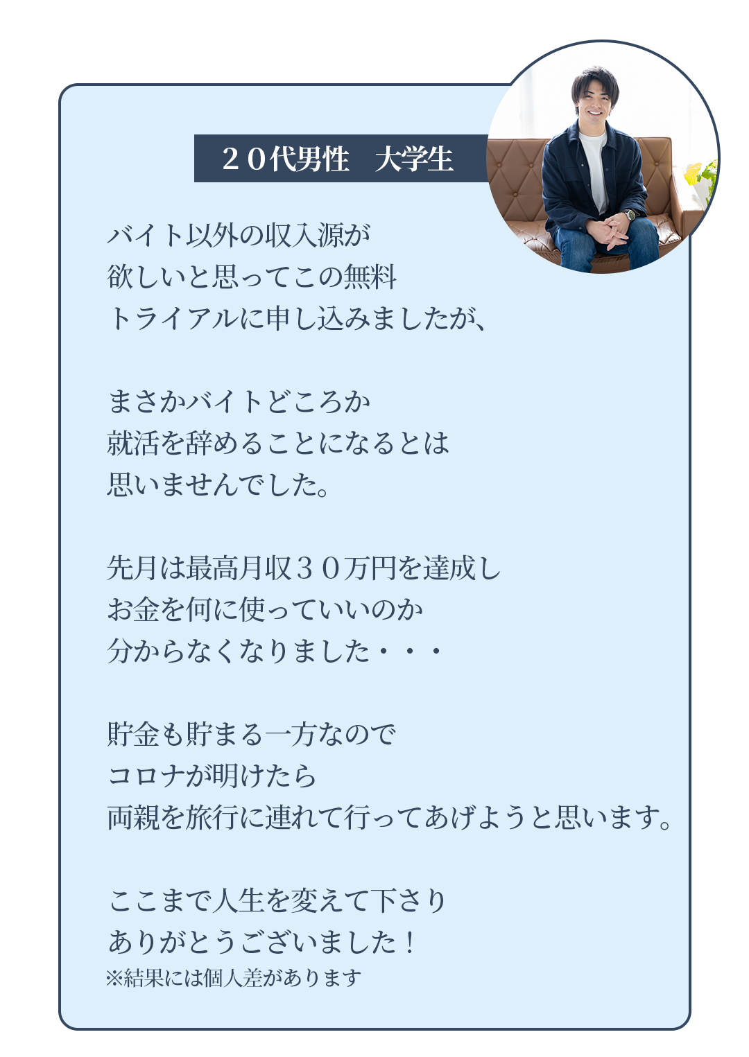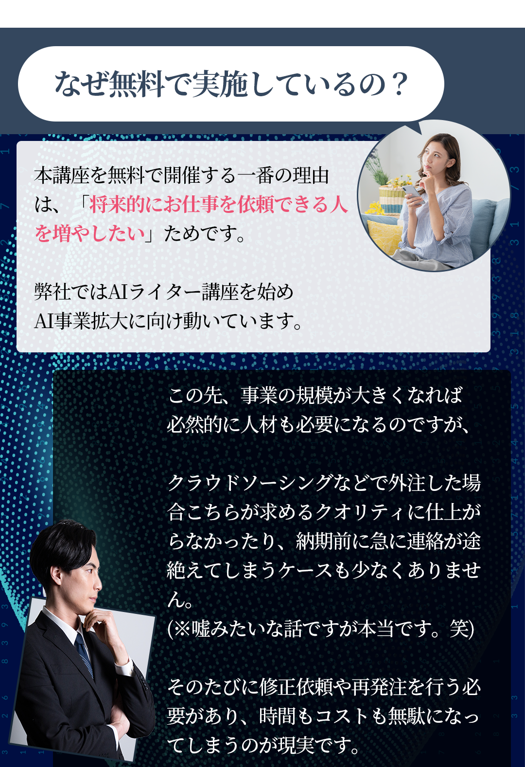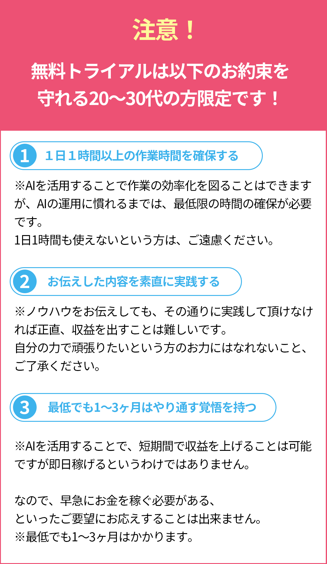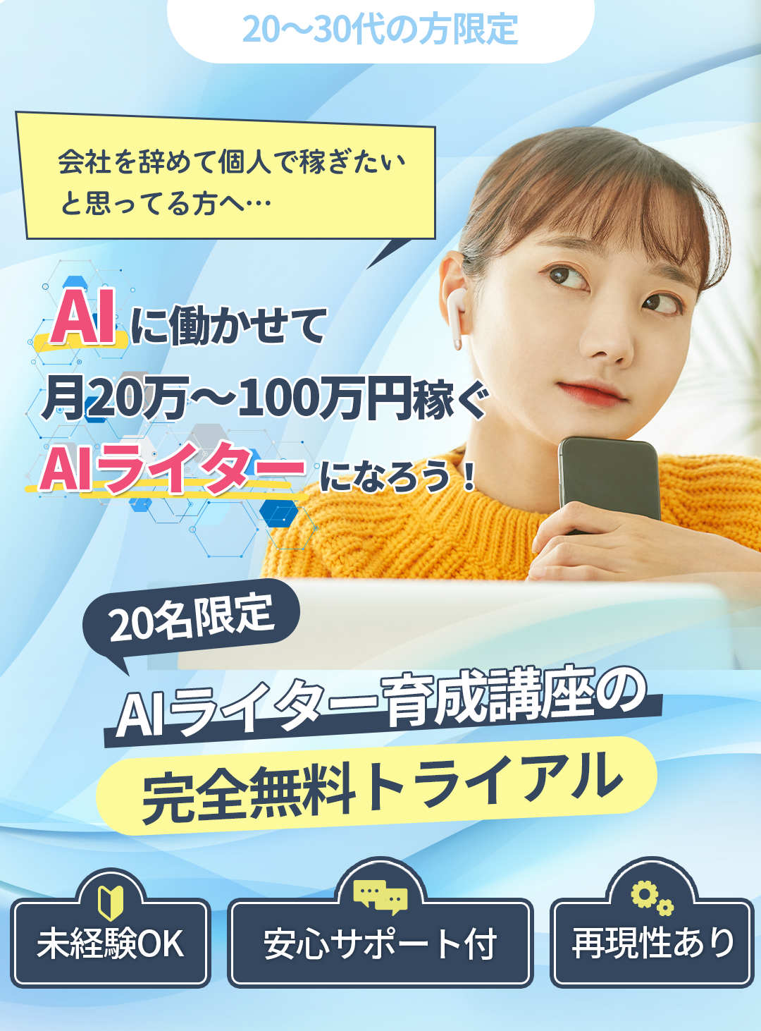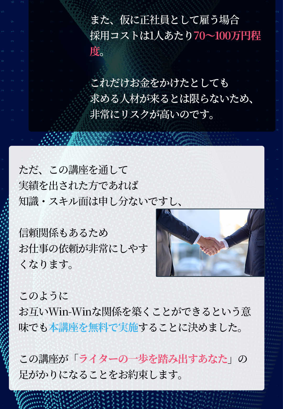 いいえ、かかりません。今回の無料トライアルを通して、webライターとして稼げる方を増やして、弊社の実績作り、社会的信頼を得ることを目的としております。