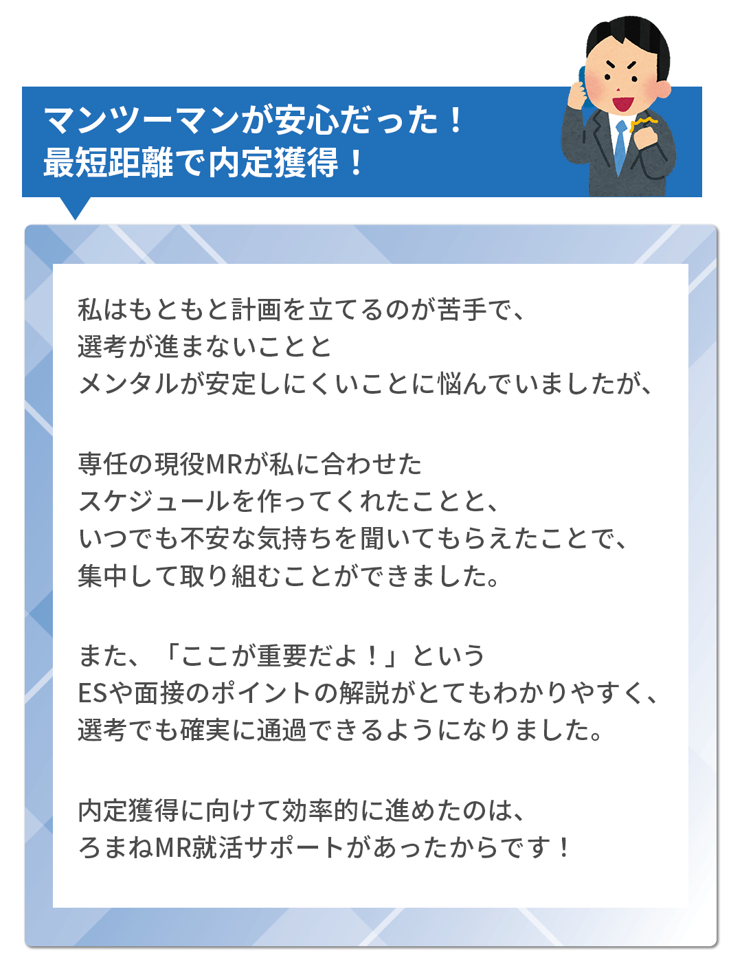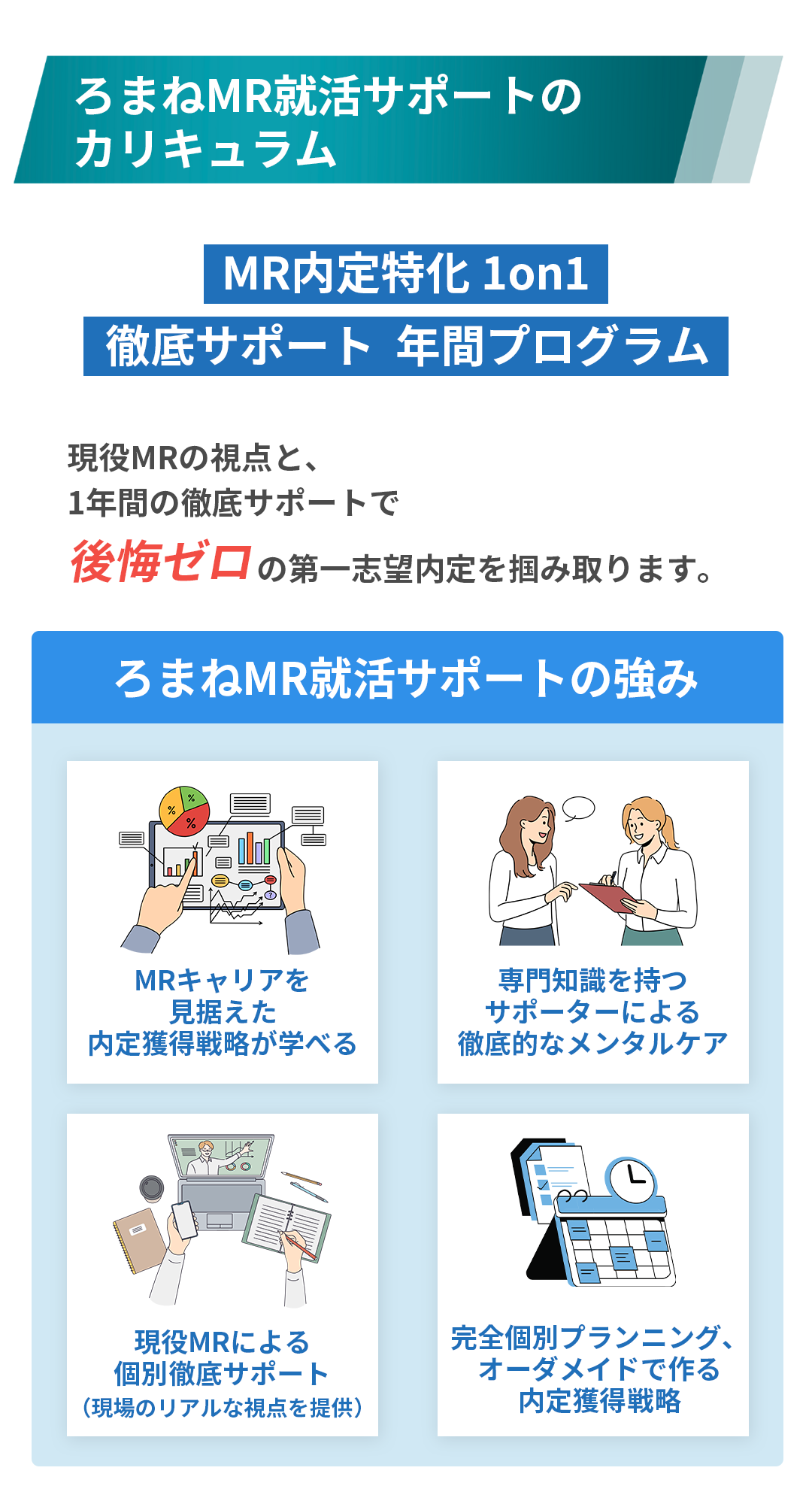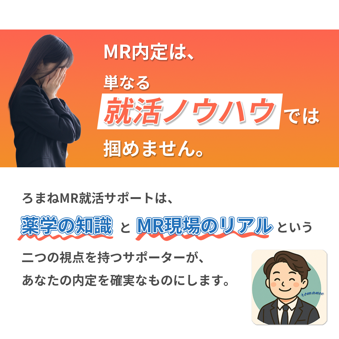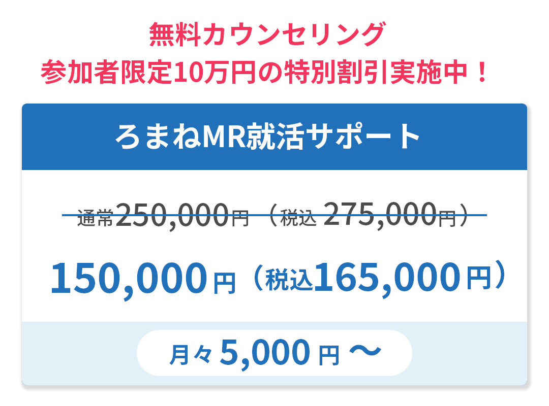 他のサービスではグループセミナーや情報提供がメインだと思いますが、ろまねMR就活サポートでは、現役MRの視点に基づき、一人ひとりの使える時間に合わせて個別カリキュラムを立てます。