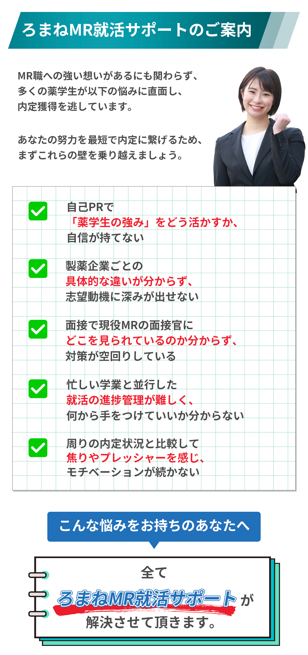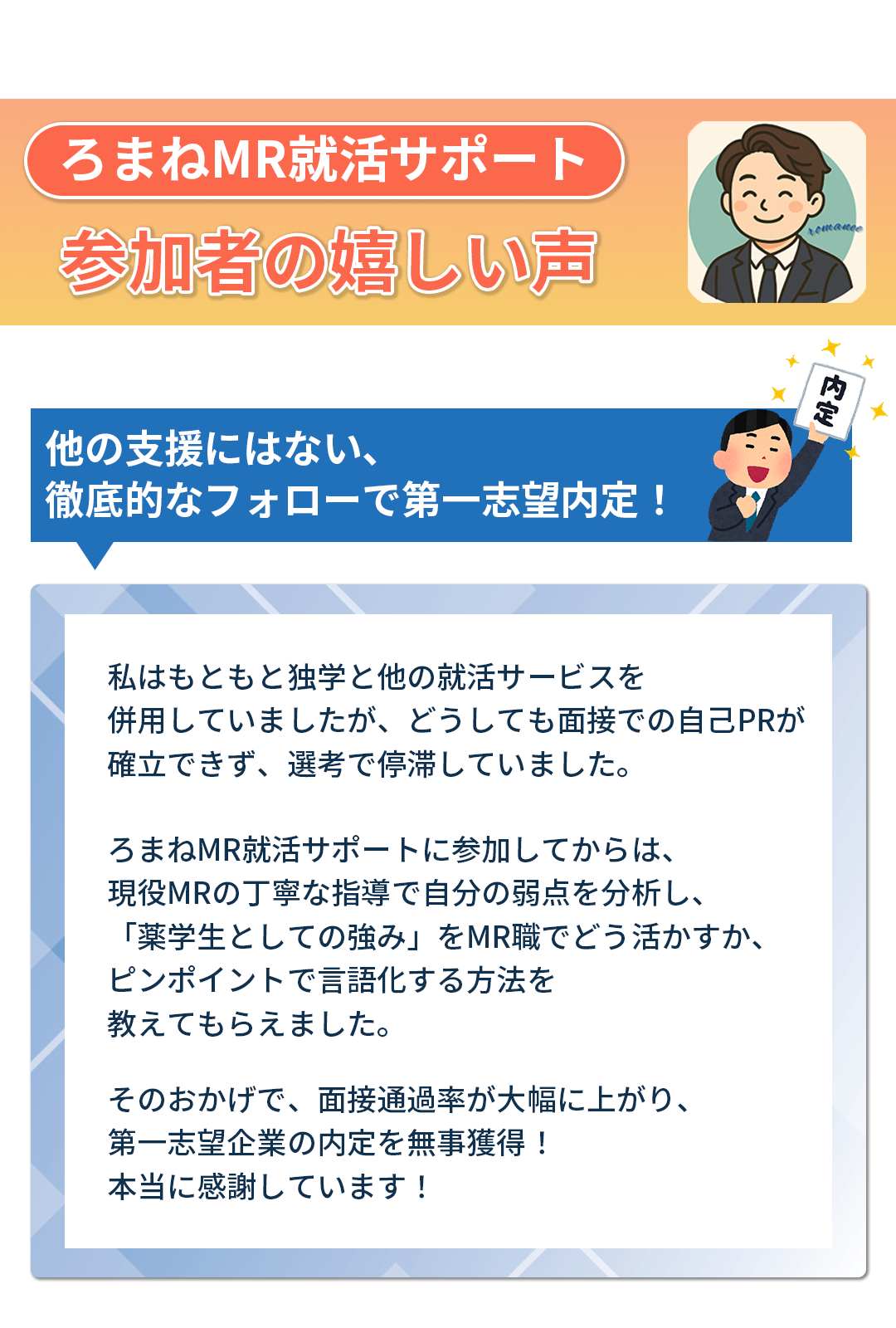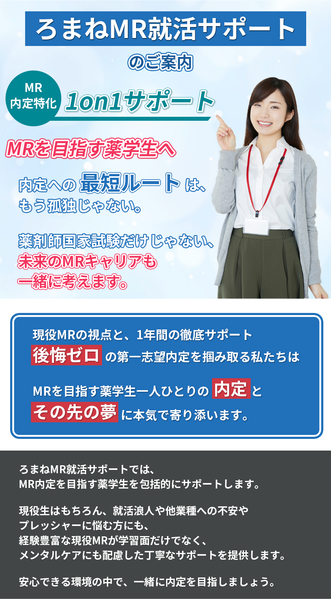 他のサービスではグループセミナーや情報提供がメインだと思いますが、ろまねMR就活サポートでは、現役MRの視点に基づき、一人ひとりの使える時間に合わせて個別カリキュラムを立てます。