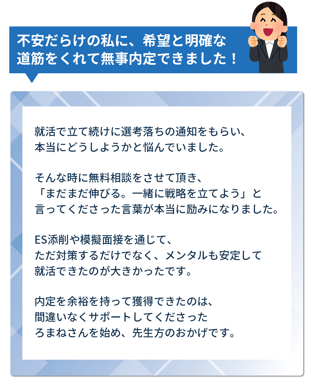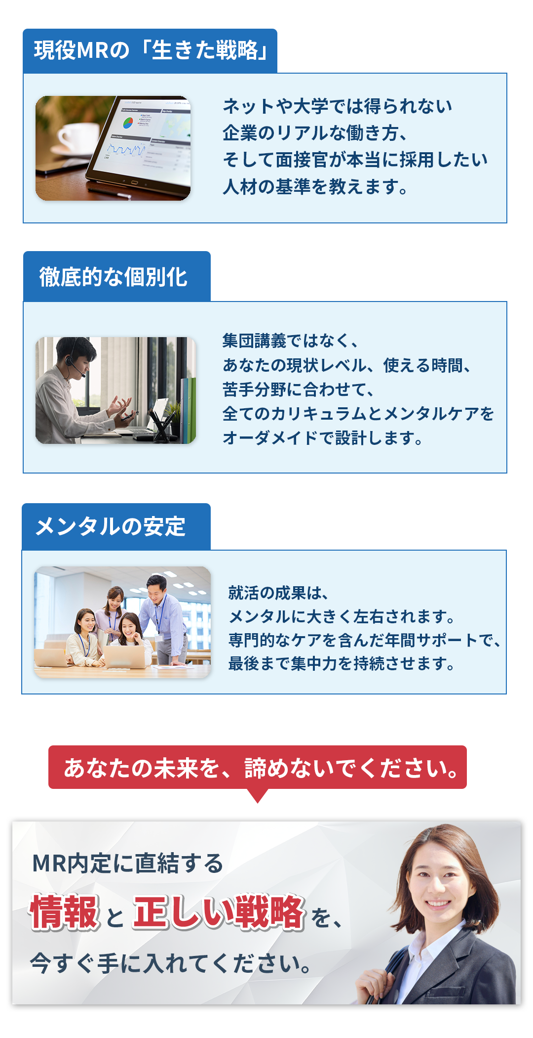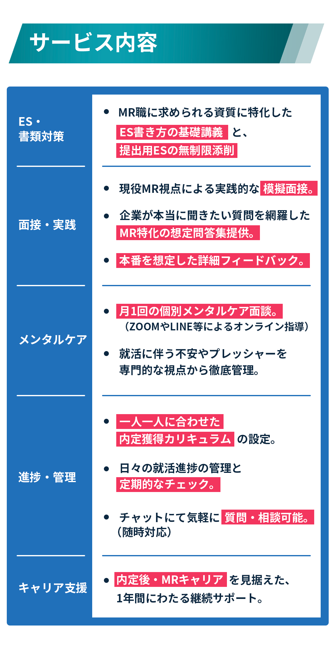 他のサービスにはない、メンタルケアや個別コーチングが魅力です。また、他のサービスをご利用の場合でも、そのスケジュールに合わせて個別カリキュラムを立てますので、内定まで一直線で進めます。